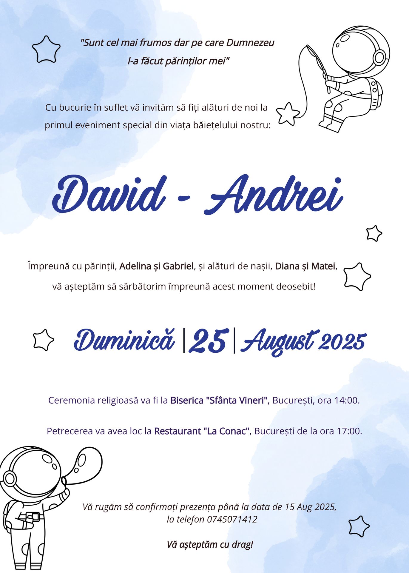 Invitația digitală „Stele de Poveste” este realizată manual, cu un design jucăuș cu stele și astronaut, disponibilă ca fișier PDF sau imagine, gata de trimis pe orice canal digital. Perfectă pentru părinții care doresc o invitație de botez modernă, personalizată și ușor de distribuit.
