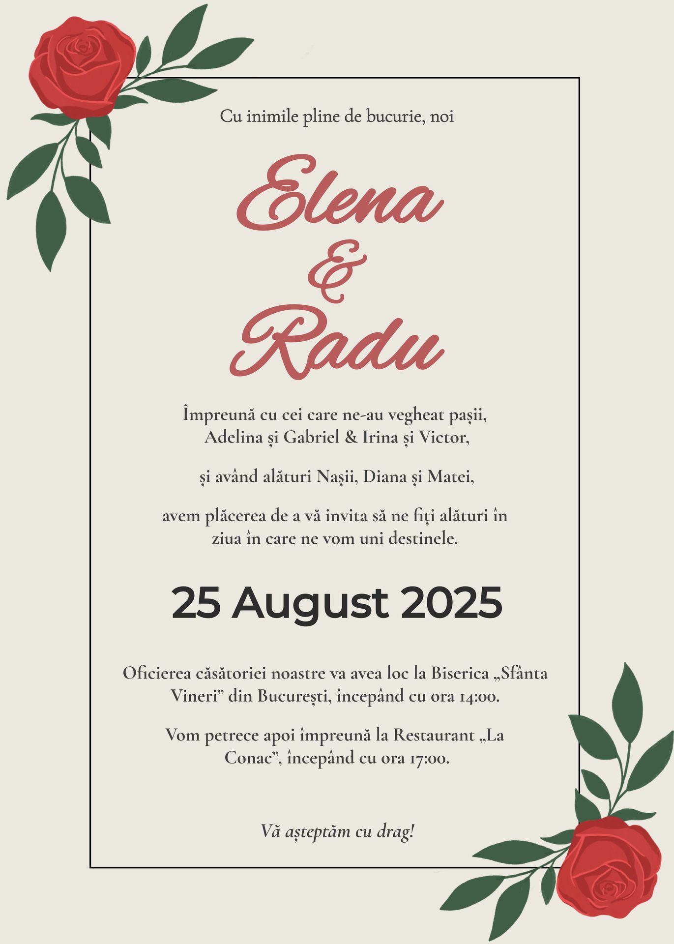 Invitația digitală „Florile Iubirii” este realizată manual, cu un design floral elegant, și este disponibilă sub formă de fișier PDF sau imagine, gata de trimis pe orice canal digital. Perfectă pentru cuplurile care doresc o invitație de nuntă modernă, rapidă și ușor de personalizat.