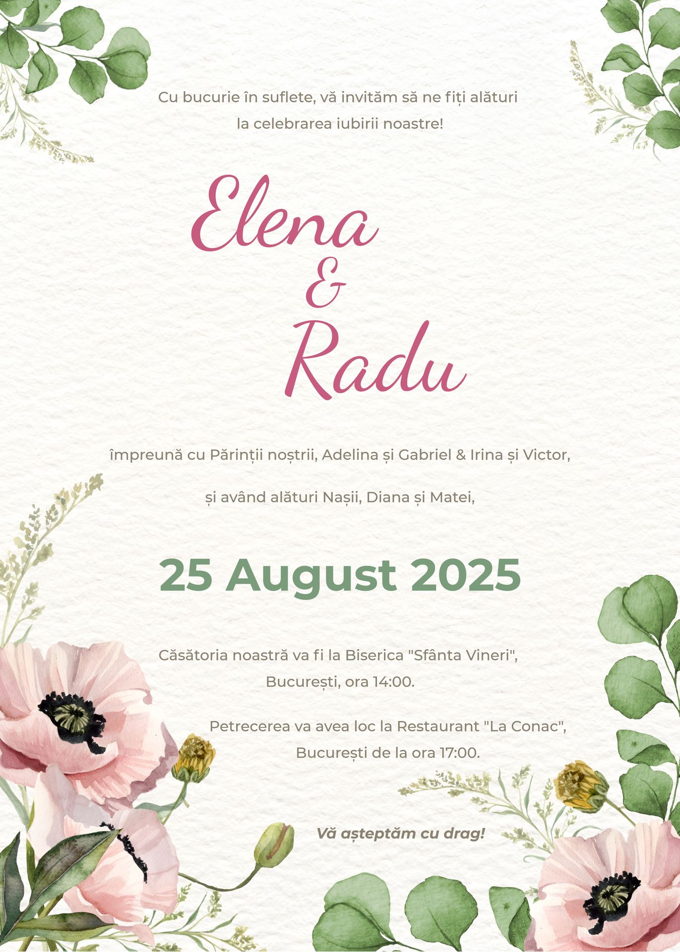 Invitația digitală „Freamăt Pastelat” este realizată manual, cu un design pastelat, elegant și modern. Este disponibilă sub formă de fișier PDF sau imagine, gata de trimis pe orice canal digital. Perfectă pentru cuplurile care doresc o invitație de nuntă personalizată, rapidă și ușor de distribuit.