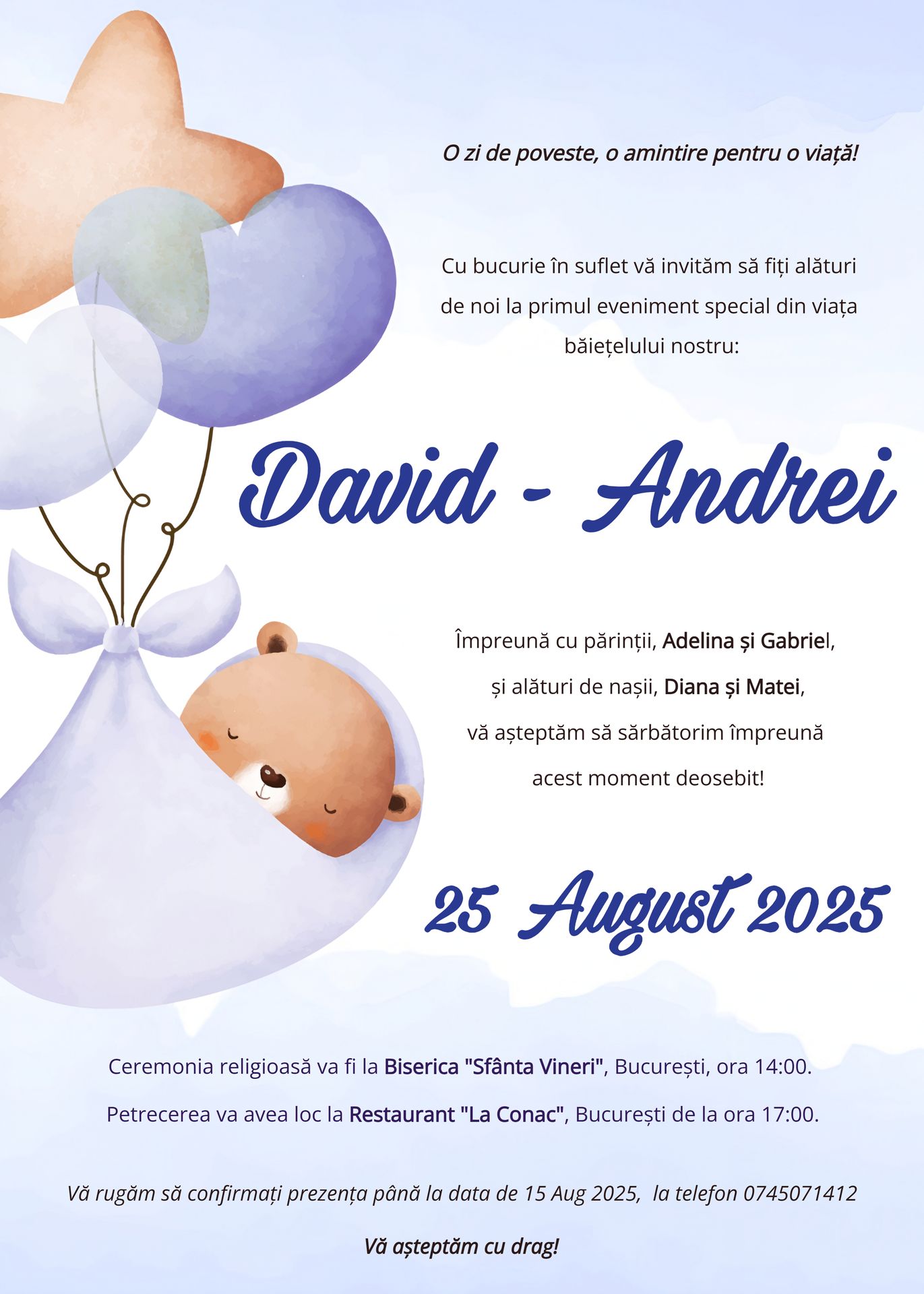 Invitația digitală pentru botez „Ursuleț Printre Nori” este realizată manual, cu un design delicat ce include un ursuleț jucăuș printre nori, disponibilă ca fișier PDF sau imagine, gata de trimis pe orice canal digital. Este alegerea perfectă pentru părinții care doresc o invitație de botez modernă, personalizată și ușor de distribuit.