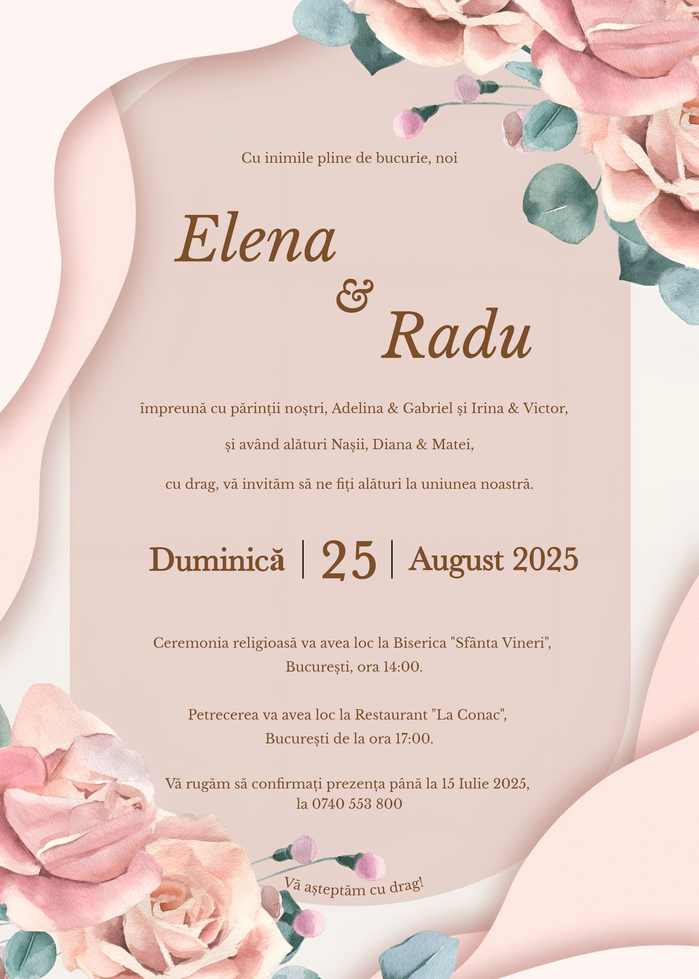 Invitația digitală „Catifea Rozalie” este realizată manual, cu un design floral elegant în nuanțe pastelate, disponibilă ca fișier PDF sau imagine, gata de trimis pe orice canal digital. Perfectă pentru cuplurile care doresc o invitație de nuntă modernă, personalizată și ușor de distribuit.
