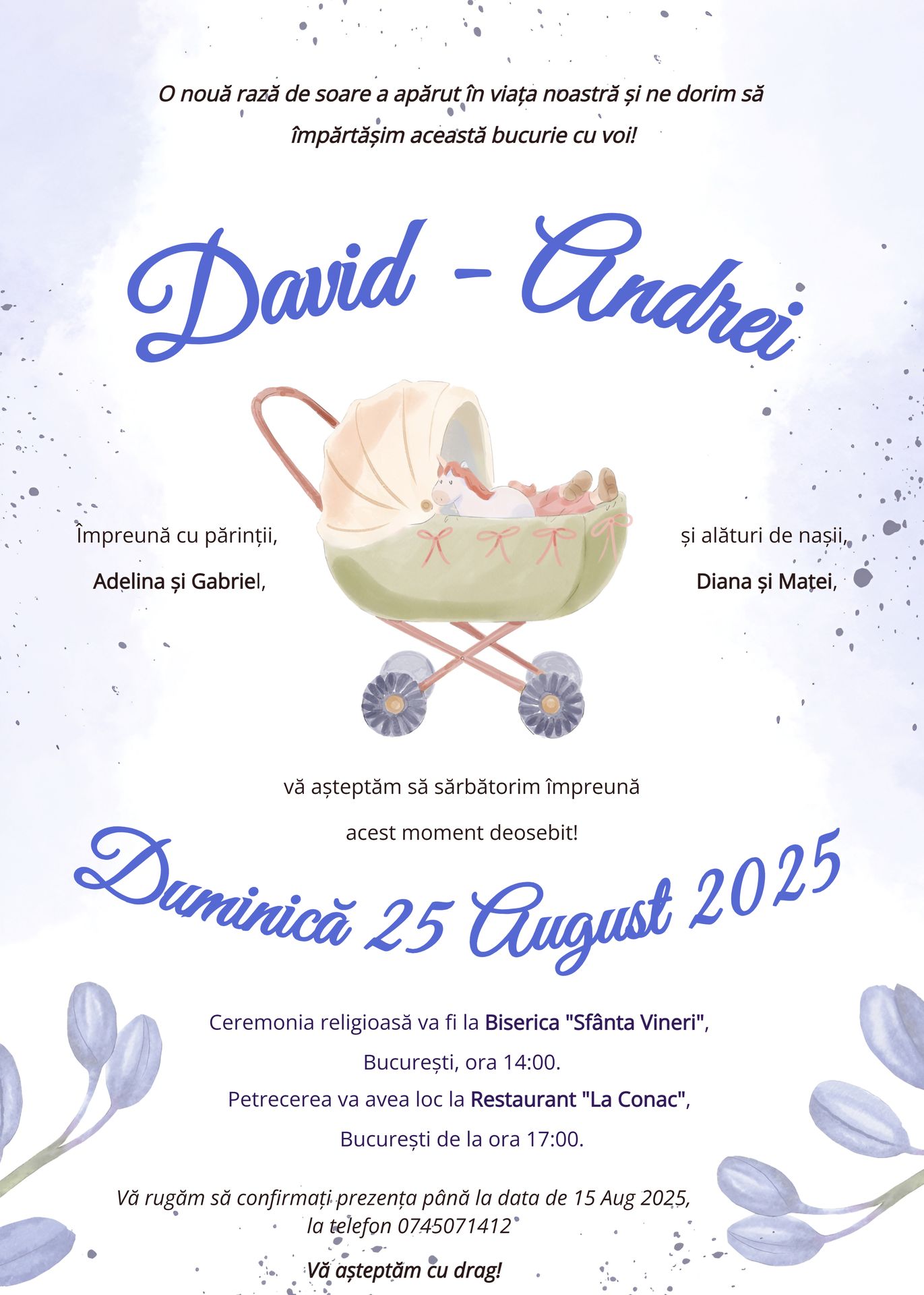 Invitația digitală „Căruțul Viselor” este realizată manual, cu un design delicat ce include un cărucior pentru bebeluși, disponibilă ca fișier PDF sau imagine, gata de trimis pe orice canal digital. Este alegerea perfectă pentru părinții care doresc o invitație de botez modernă, personalizată și ușor de distribuit.