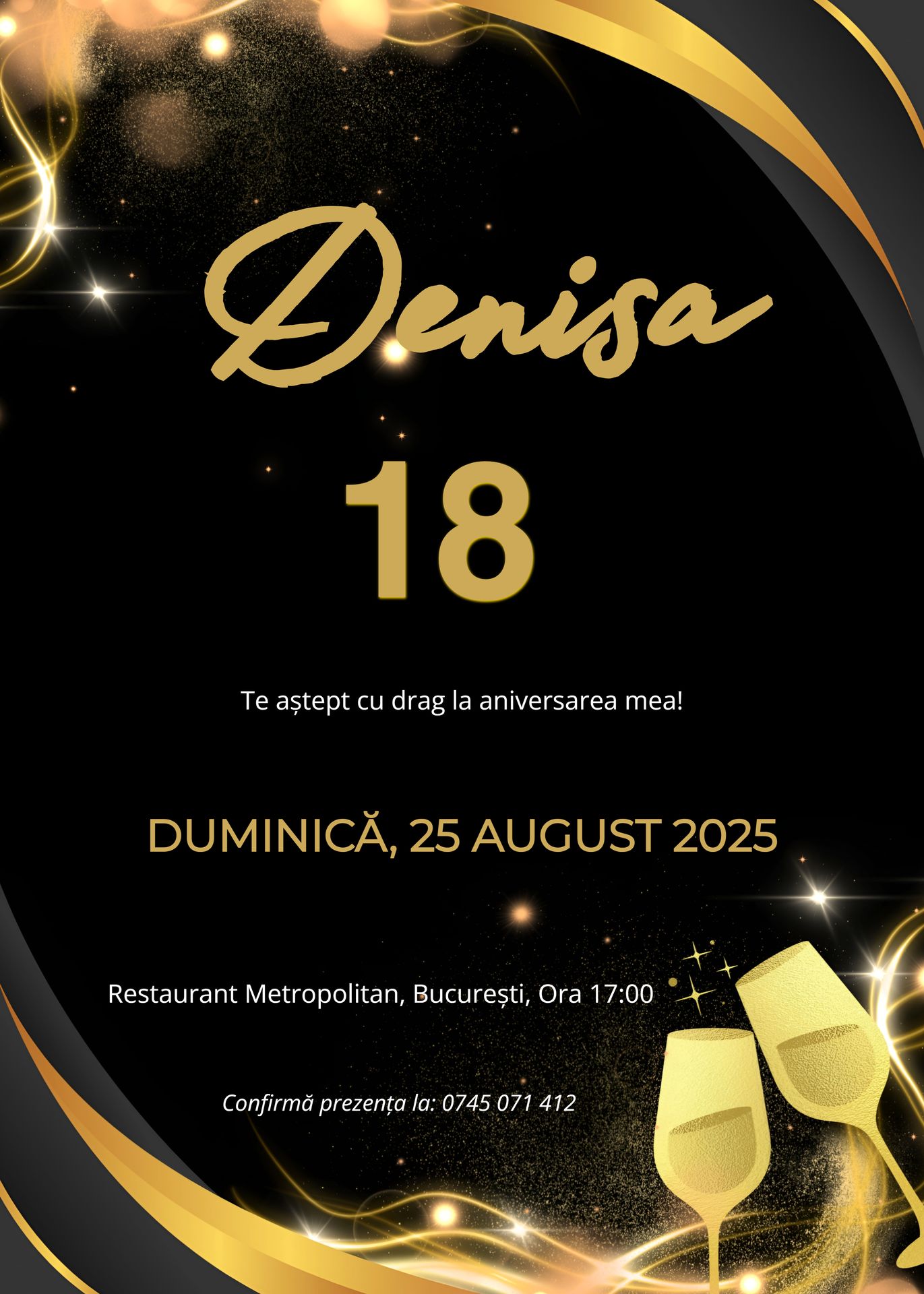 Invitația digitală „Aură de Majorat” este creată manual, cu un design elegant și festiv, în nuanțe aurii, disponibilă ca fișier PDF sau imagine, gata de trimis pe orice canal digital. Perfectă pentru cei care doresc o invitație de majorat modernă, personalizată și ușor de distribuit.