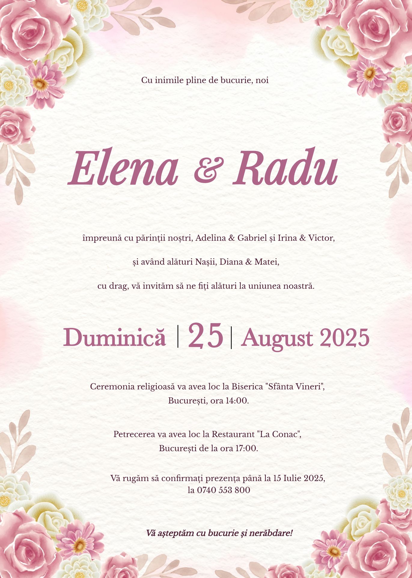 Invitația digitală „Grădina Promisiunilor” este realizată manual, cu un design floral romantic, disponibilă ca fișier PDF sau imagine, gata de trimis pe orice canal digital. Este alegerea perfectă pentru cuplurile care doresc o invitație de nuntă modernă, personalizată și ușor de distribuit.