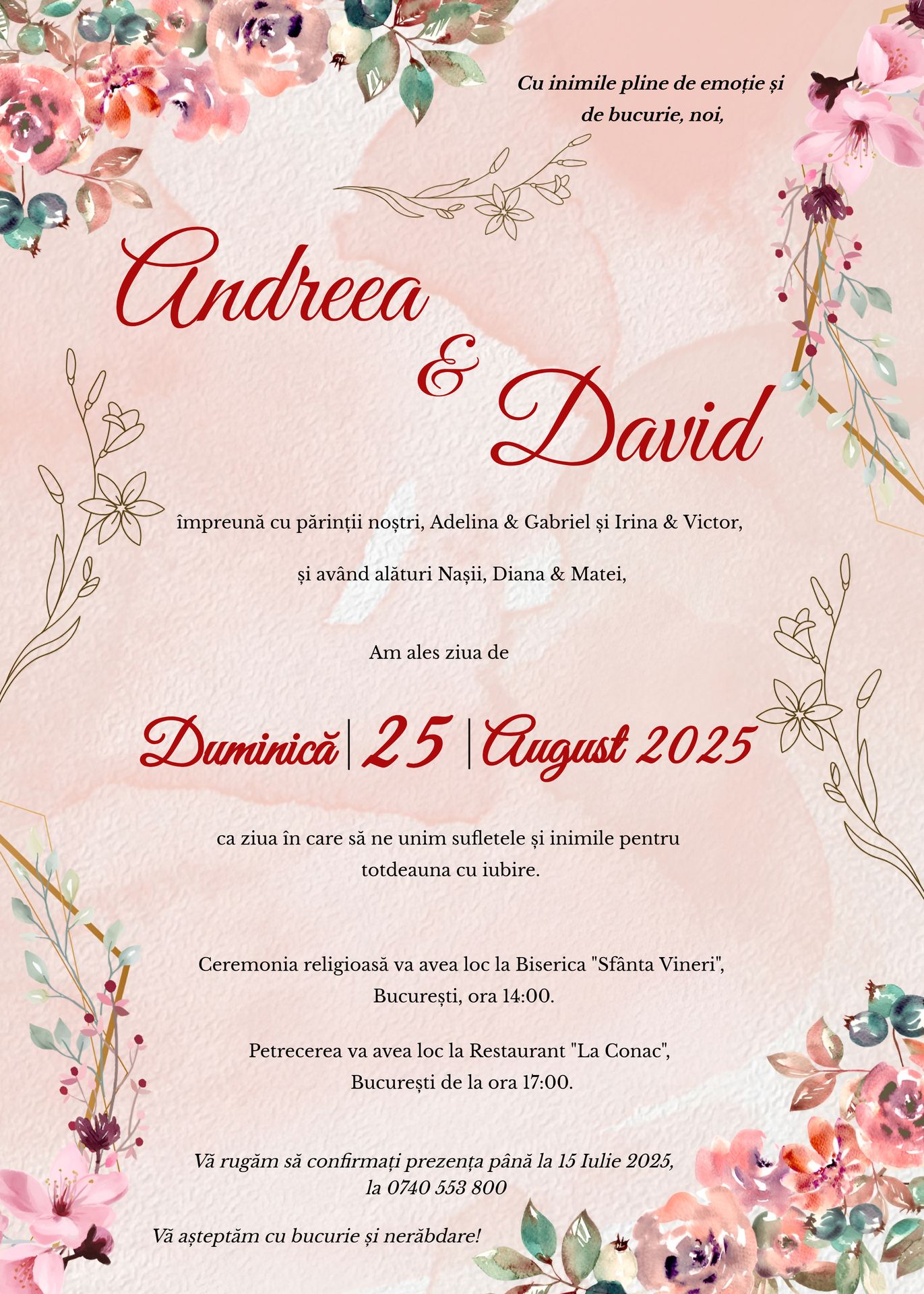 Invitația digitală „Petale de Legământ” este realizată manual, cu un design floral romantic, disponibilă ca fișier PDF sau imagine, gata de trimis pe orice canal digital. Este alegerea perfectă pentru cuplurile care doresc o invitație de nuntă modernă, personalizată și ușor de distribuit.